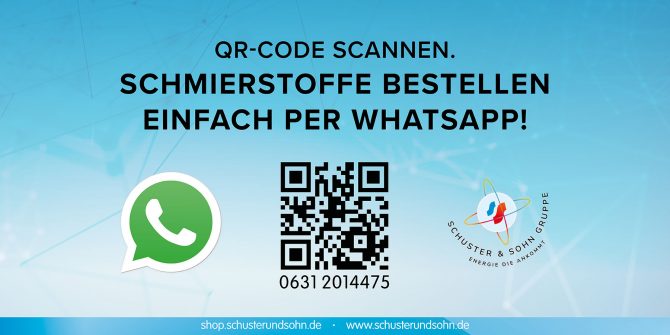 QR-CODE SCANNEN. SCHMIERSTOFFE BESTELLEN EINFACH PER WHATSAPP! Jetzt schnell und vollkommen unkompliziert per WhatsApp die neue Bestellung an uns aufgeben. Und selbstverständlich kann man uns auch zu jedem anderen Anliegen rundum Schmierstoffe hierüber kontaktieren.Wir sind für Dich da, um was auch immer es geht.Dein Schuster & Sohn Schmierstoff Team